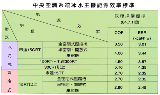 冷水機組能源效率比值(EER)依CNS12575容積士冰水機及CNS12812離心式冰水機組規定試驗之冷卻能力(Kcal/h)除以規定之冷卻消耗電功率(w),